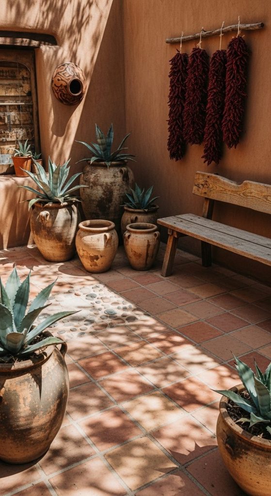 Picture this: terra cotta tiles, adobe walls, a weathered wooden bench — and agaves stealing the show. That’s pure Southwestern magic.