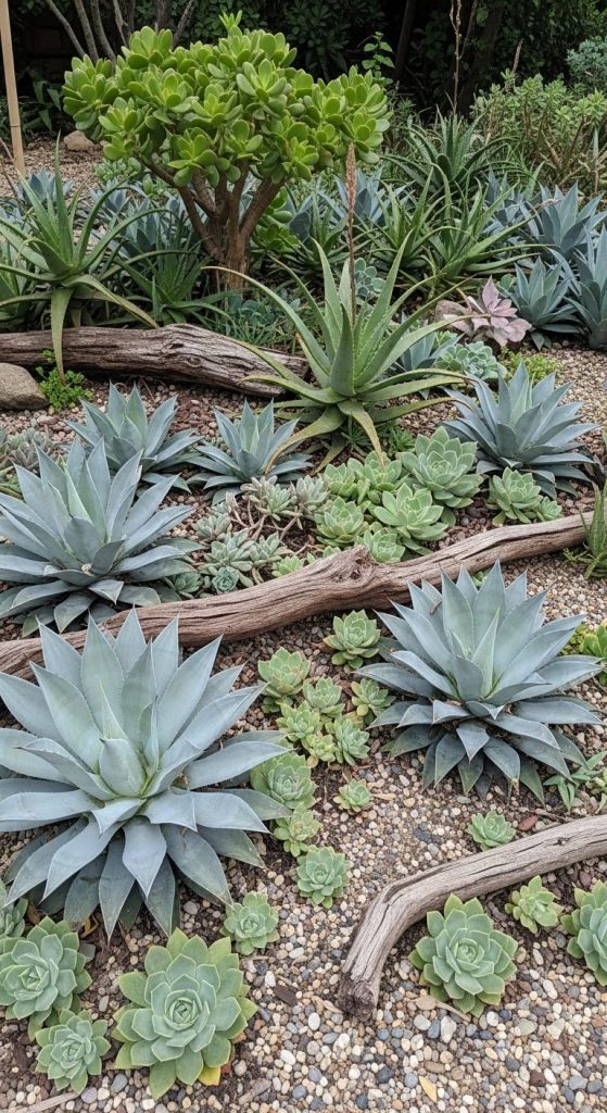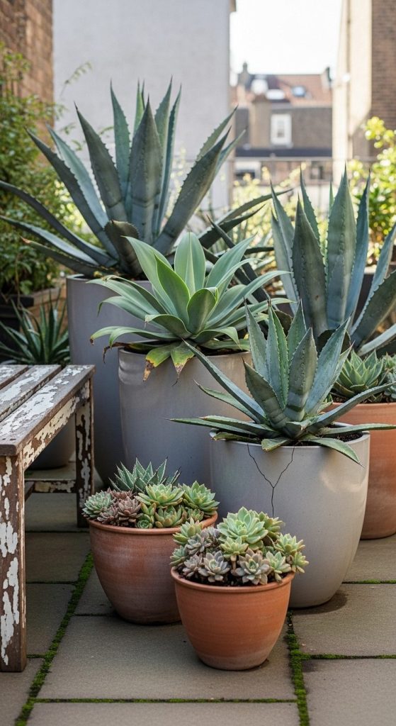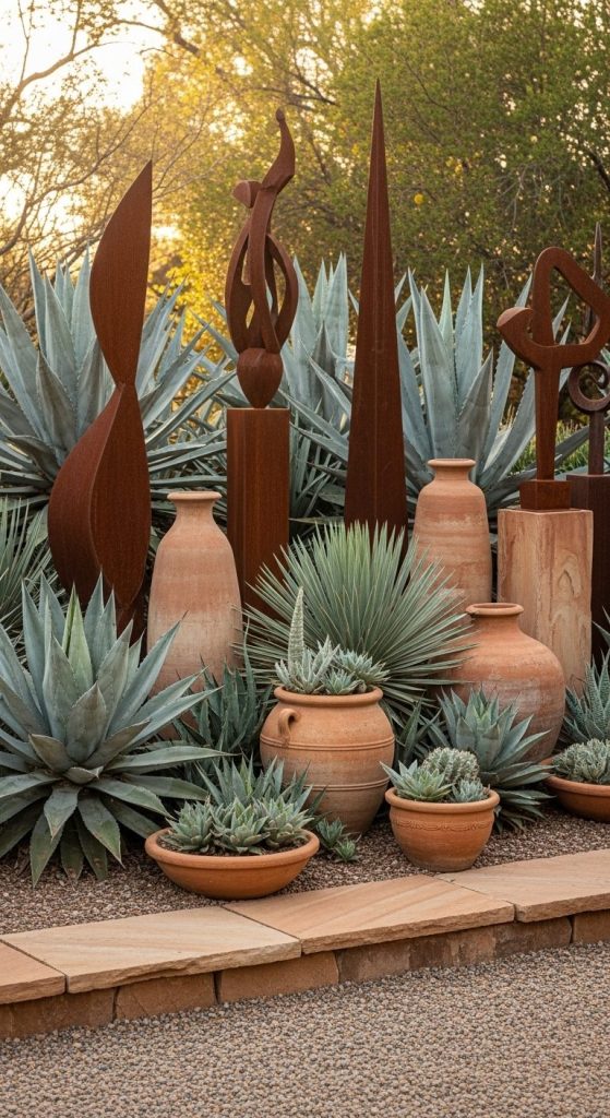 Why not mix metal sculptures, pottery, or driftwood with agaves? The visual synergy is unbeatable.