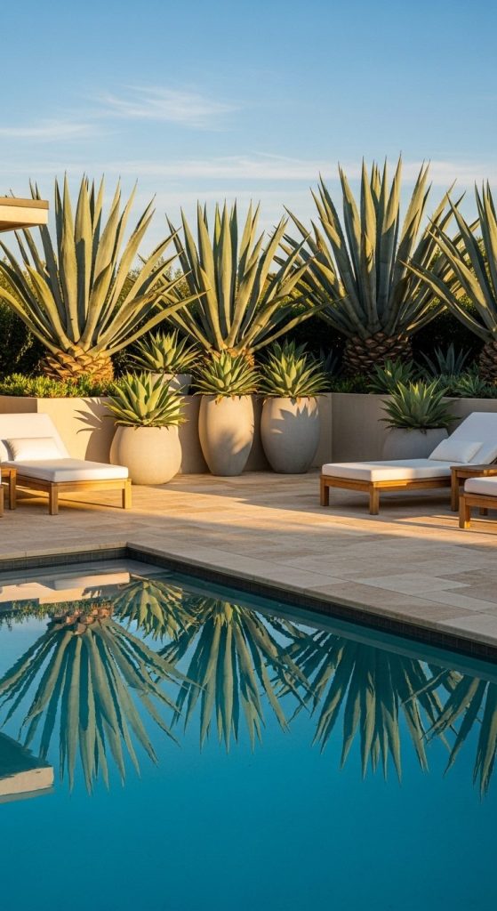 Ever seen an agave reflected in pool water at sunset? It’s stunning. These plants love the dry heat around pools and look ultra-modern beside blue tiles.