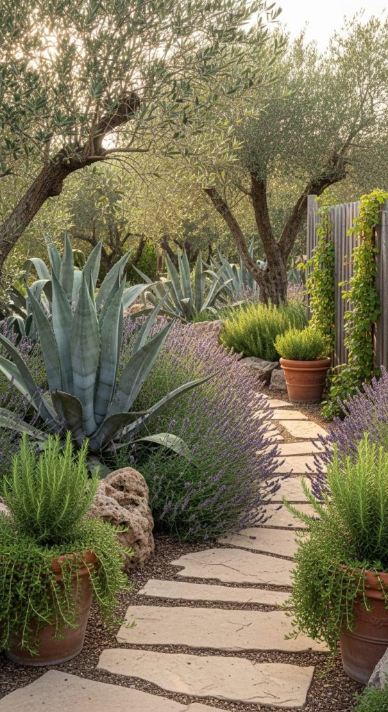 Agaves actually pair beautifully with Mediterranean plants like lavender, rosemary, and olive trees.