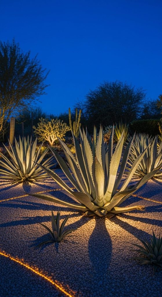 Highlight agaves at night with soft uplighting — they turn into glowing sculptures after sunset.