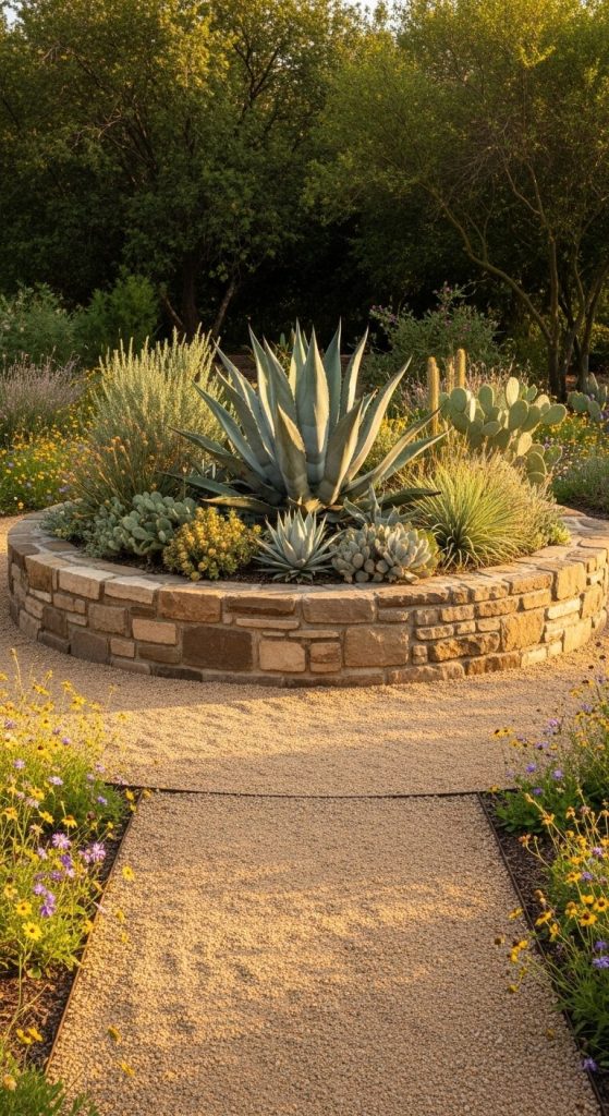 Create a circular or raised “island” bed with mixed desert plants — agaves as the centerpiece.
