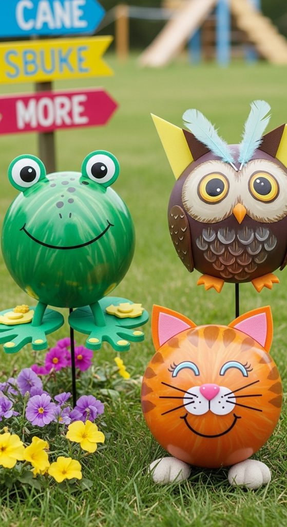 Paint cute animal faces like frogs, owls, or cats onto the ball. Add small ears or details using craft foam and glue for a 3D effect. These whimsical designs are perfect for garden beds or kids’ rooms.