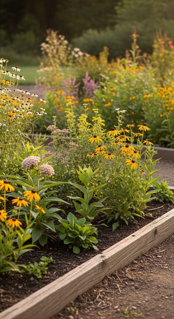 Raised beds balance function and beauty — perfect for mixing nectar plants, herbs, and host greenery neatly.