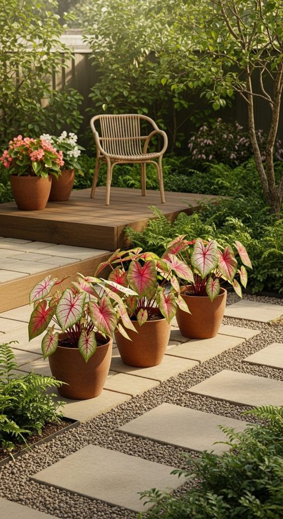 If your space is limited, pots and containers are perfect. I once arranged a trio of caladiums in deep terracotta pots on a small patio, and it instantly felt tropical and inviting.