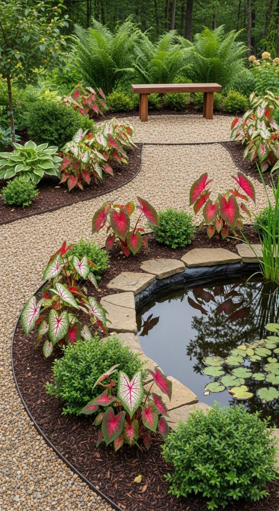 Takeaway: Caladiums near water naturally elevate the ambiance of fountains or small ponds.