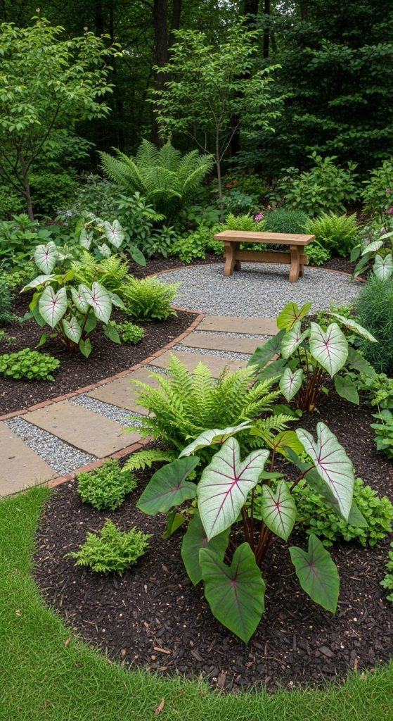 Layering caladiums beneath taller shrubs and trees creates depth and a woodland retreat vibe. I’ve done this with hostas and ferns, and the visual rhythm is almost like a forest floor painting.