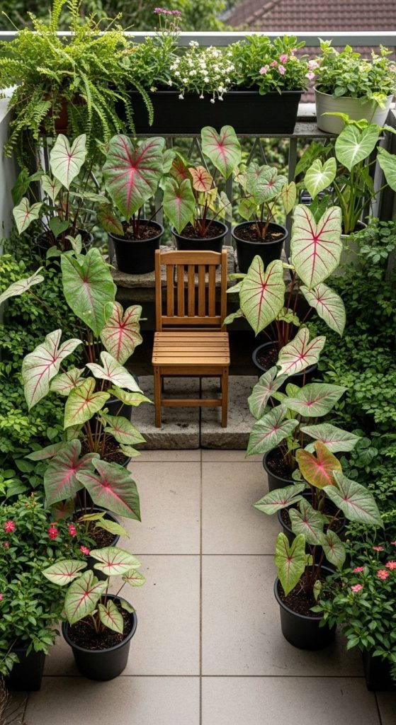 Even apartment balconies can feel lush with caladiums. Grouping pots of different leaf colors and sizes creates a mini tropical escape.