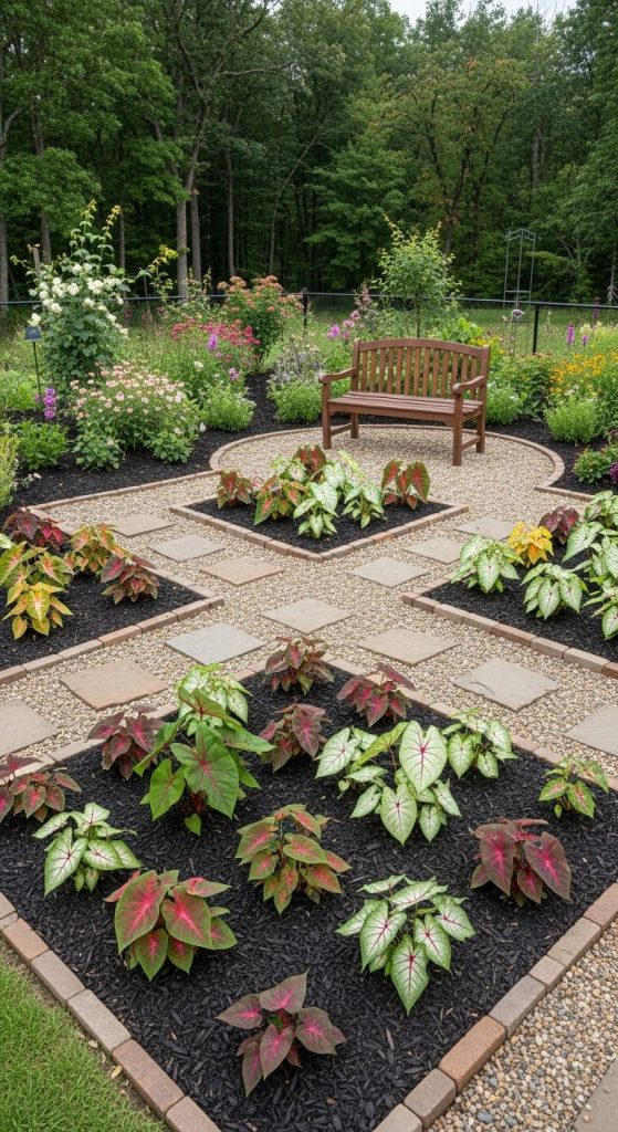 Using caladiums to create patterns — stripes, waves, or color blocks — gives the garden a playful, structured look. I tried a diagonal red and white stripe once, and it drew attention from the street.