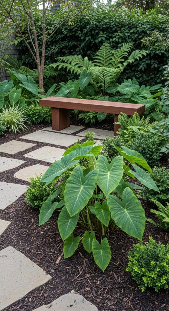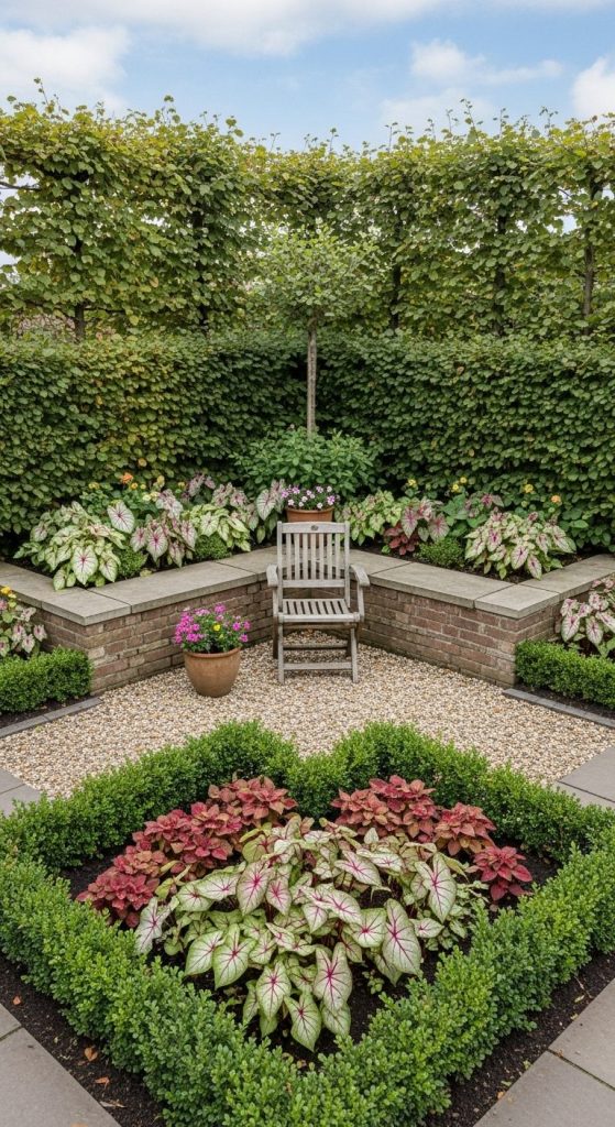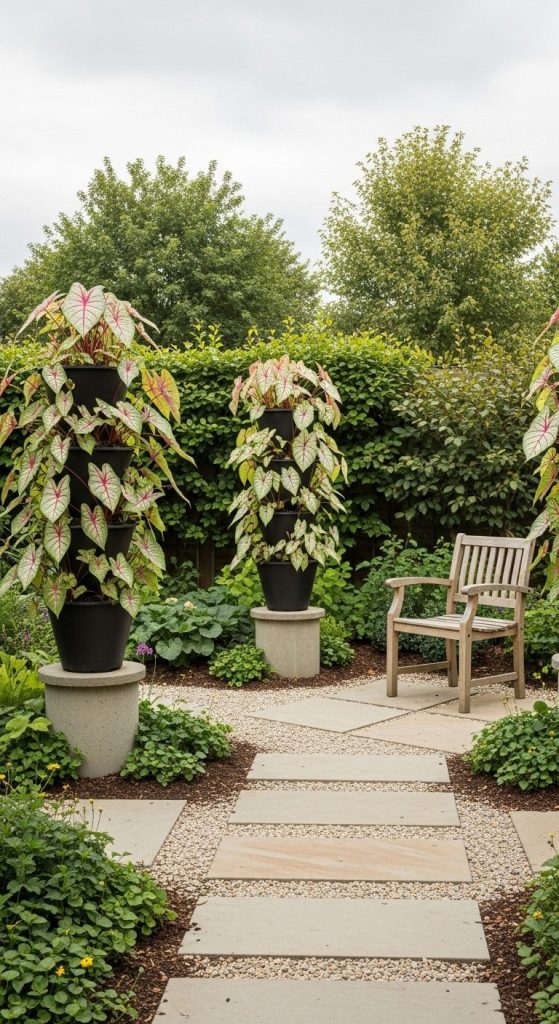 Use dwarf caladium varieties to form low hedges around garden corners or seating areas. I once did this along a small patio, and it felt playful and vibrant.