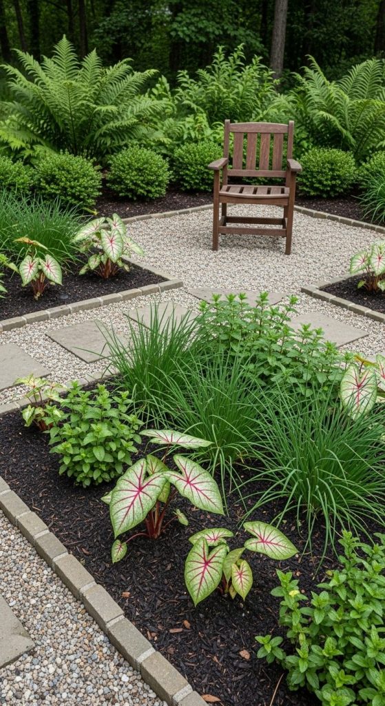 Pairing caladiums with ferns combines soft, feathery textures with bold leaf colors. It’s an effortless way to add dimension to a shady corner.