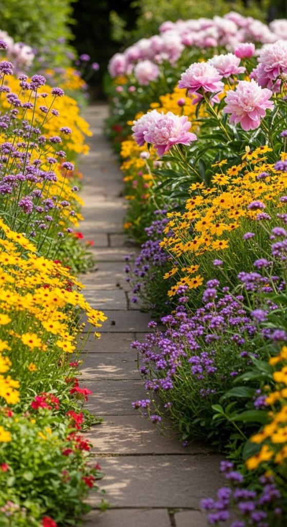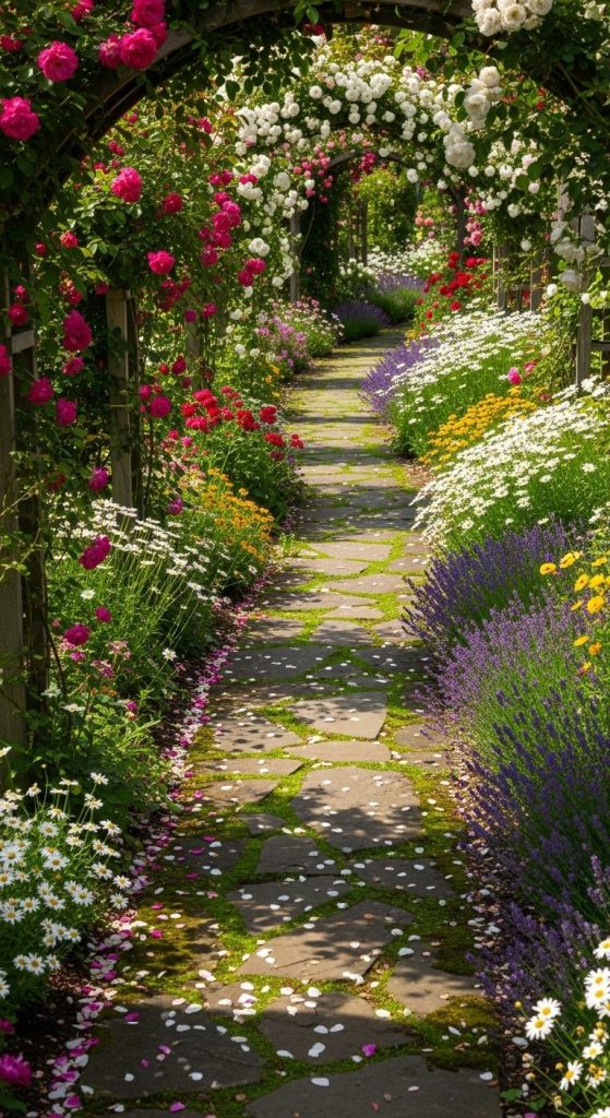 Nothing says “come wander” like a meandering stone path weaving through dense flowers. It’s functional, yes, but also romantic.