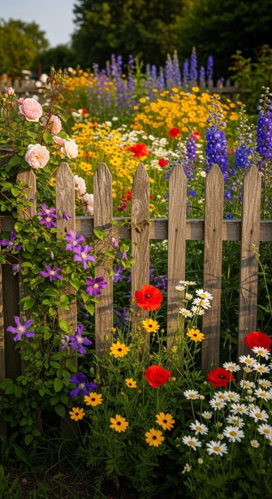 Forget pristine fences — think weathered wood, white pickets, or wrought iron wrapped in climbing roses. The fence becomes part of the story.