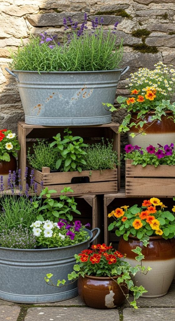 Old metal tubs, wooden crates, and ceramic pots — these aren’t just containers; they’re character pieces.