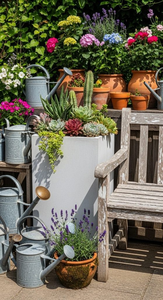Combine modern planters with antique garden decor — think rusty watering cans beside sleek benches. It’s all about contrast.