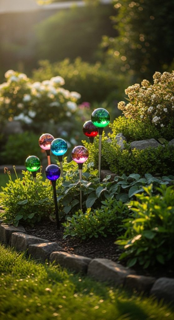 Colorful glass balls perched on stakes instantly add reflective beauty, catching sunlight and creating rainbow glimmers. Perfect for adding sparkle to shaded corners.