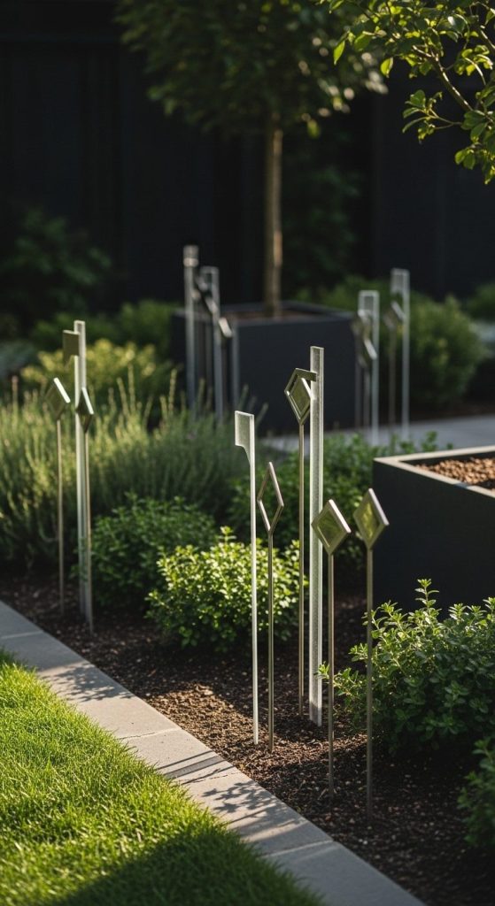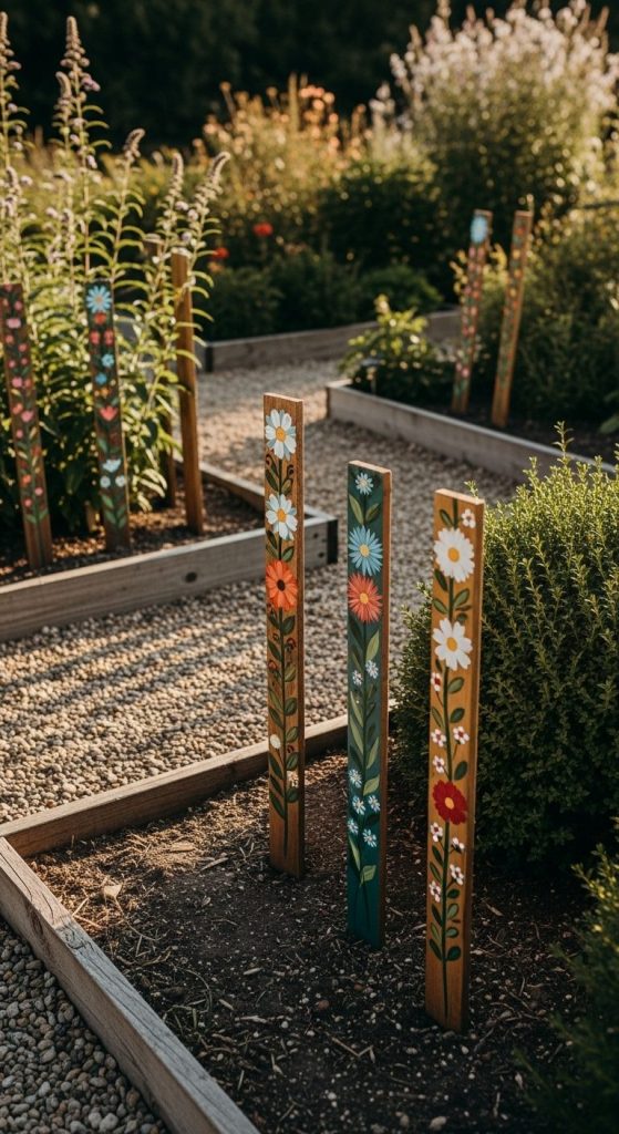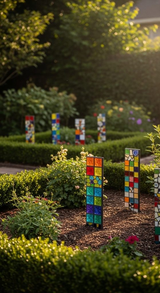 Stakes decorated with colorful mosaic tiles or glass pieces catch light and add a splash of creativity. Think tiny garden mosaics rising from the soil.