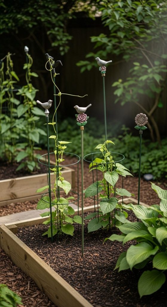Combine function and form by using stakes that support climbing plants or vines while featuring decorative finials like flowers, birds, or geometric shapes.
