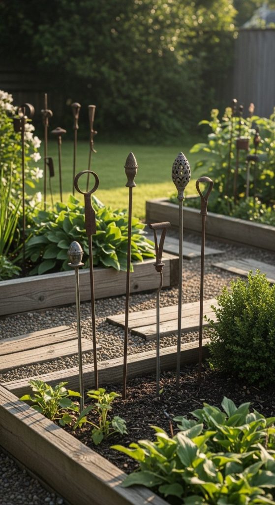Repurpose old tools, fence finials, or heirloom pieces as decorative stakes for a nostalgic touch.