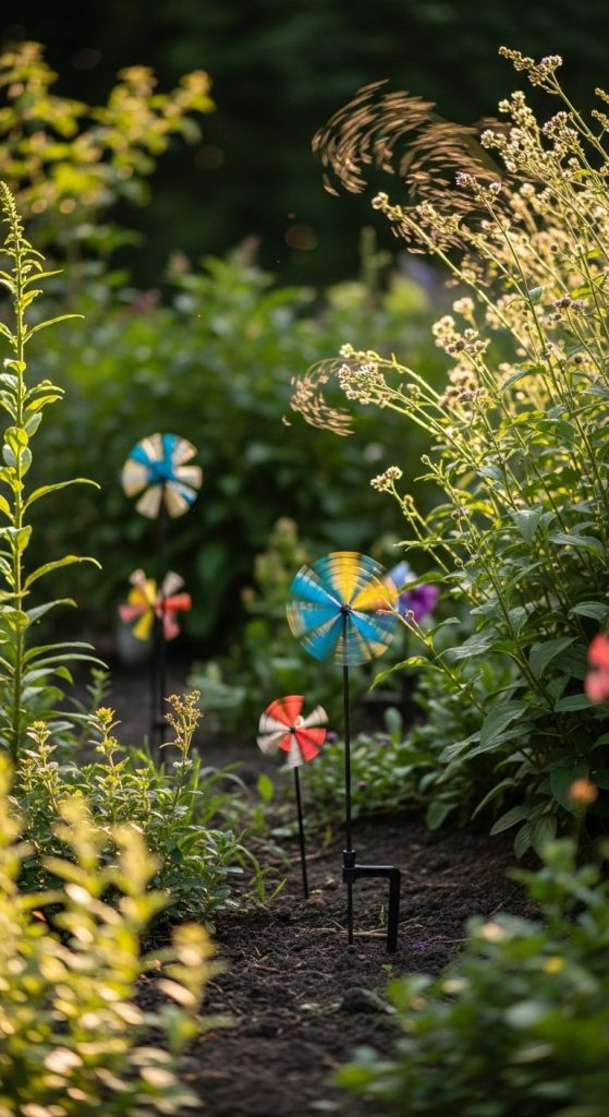 Spinners, whirligigs, or rotating elements bring motion to your garden and catch attention on breezy days.