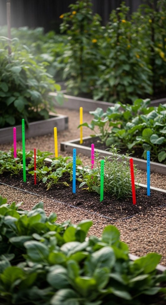 Takeaway: Color-coded stakes are functional art, keeping gardens organized and visually appealing.