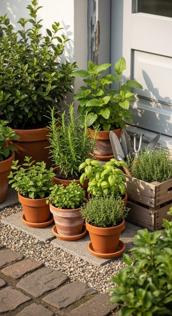 Most herbs grow well in pots, making this corner accessible for families with limited space. You can place them near seating or the kitchen door for convenience.