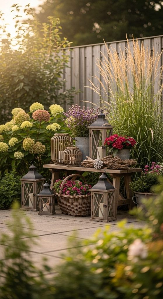 A small rotating decor corner keeps the garden interesting year-round—lanterns in winter, flowers in spring, soft lights in summer, rustic baskets in autumn. It’s simple but brings a lot of personality.