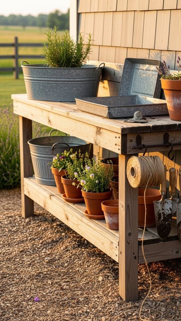 If you want a quick way to make your garden look intentional, a rustic potting bench sets the scene beautifully.