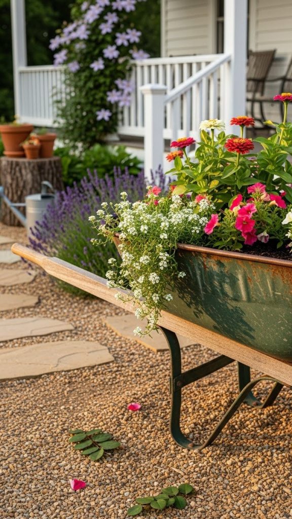 You’ve probably seen this one before because it’s simple and adorable. A vintage wheelbarrow—real metal, slightly rusty, slightly dented—filled with overflowing flowers. It instantly adds character and works perfectly for farmhouse gardens.