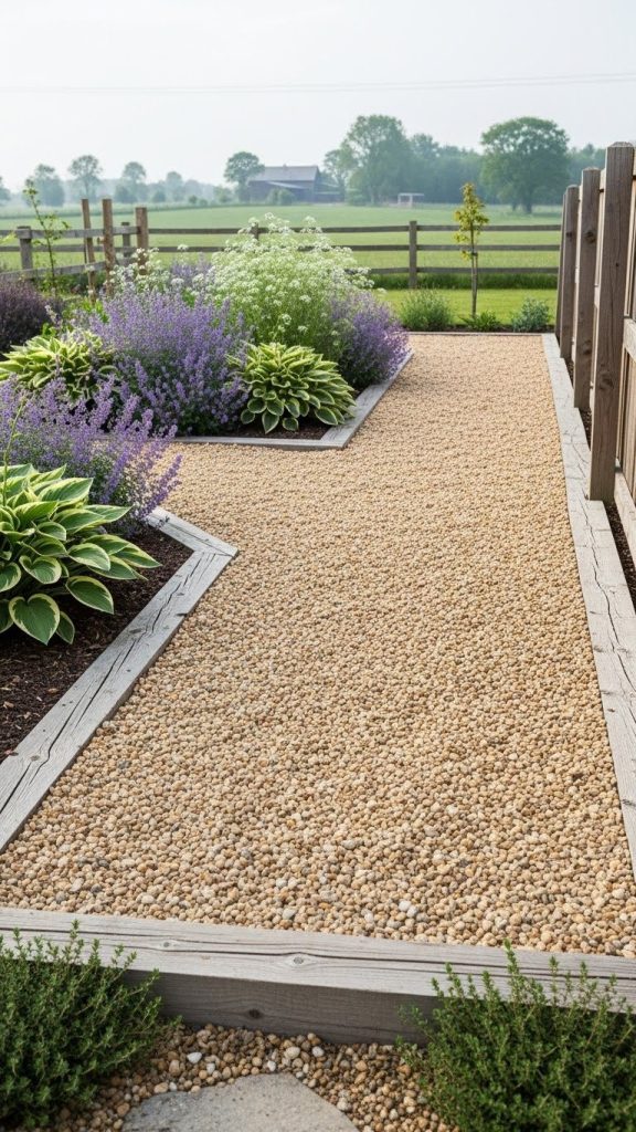Gravel pathways are a classic farmhouse choice. They feel relaxed and welcoming, and they don’t cost as much as stone pavers. Add simple wooden edging—or even low log rounds—and you get that traditional, slightly rugged farmhouse vibe.