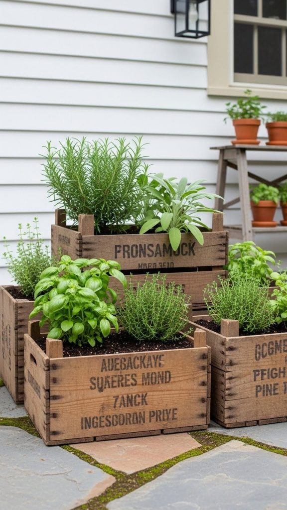 Old wooden crates make the cutest herb planters. Whether they’re stacked, lined up, or arranged on shelves, they create a rustic, functional look. Herbs like rosemary, thyme, sage, and basil thrive with good drainage, so the crates work surprisingly well.