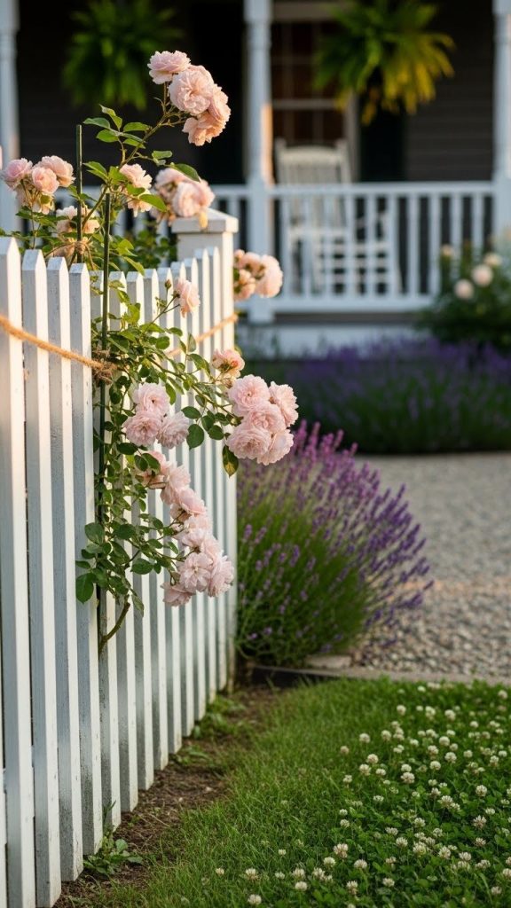 There’s something instantly nostalgic about a white picket fence. Pair it with soft climbing roses—like New Dawn or Eden—and you’ll create one of the most iconic farmhouse looks out there.