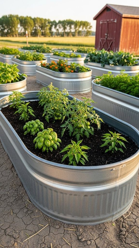 Stock tank planters are practical, affordable, and surprisingly stylish. They fit perfectly into farmhouse gardens because they have that rustic metal look. People use them for tomatoes, peppers, herbs, and even small fruit shrubs.