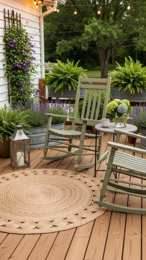 A small seating area with wooden rocking chairs, a jute rug, and lanterns brings porch vibes into your garden. Even if you don’t have a porch, you can style an outdoor corner to feel like one.