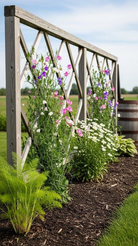 A wooden trellis is a simple upgrade that transforms a plain corner. Weathered wood adds character, while climbers like sweet peas or runner beans bring color and fragrance.