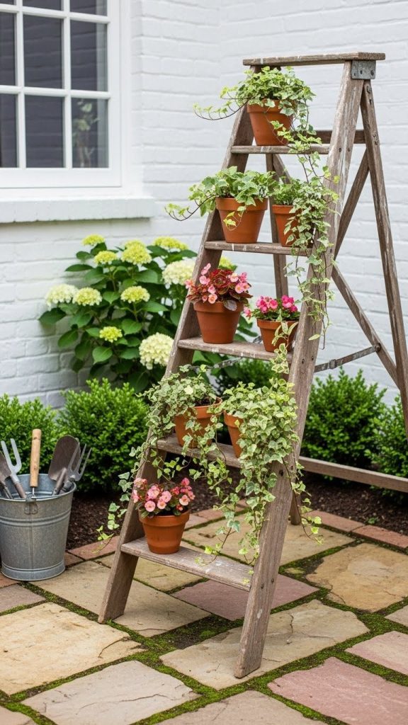 A worn wooden ladder makes the perfect tiered plant stand. The imperfections—scratches, faded color—make it even better. Place small terra-cotta pots on each step and let trailing plants spill over.