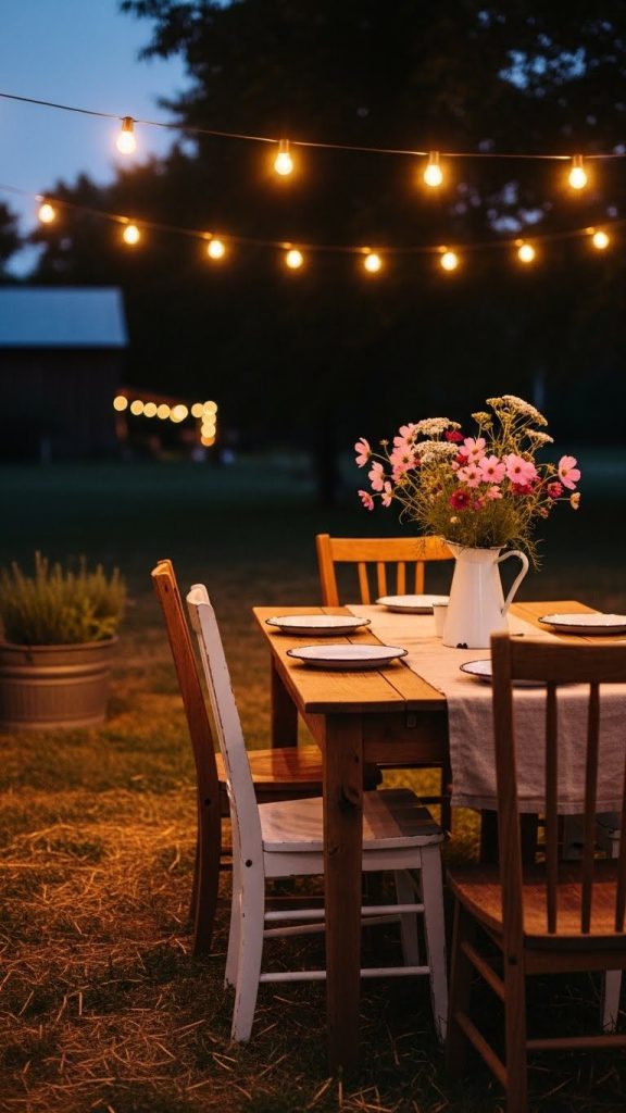 Outdoor meals always hit differently, but a farmhouse-style dining nook makes them feel extra special. A wooden table, mixed chairs, enamelware plates, and warm string lights create that relaxed country atmosphere.