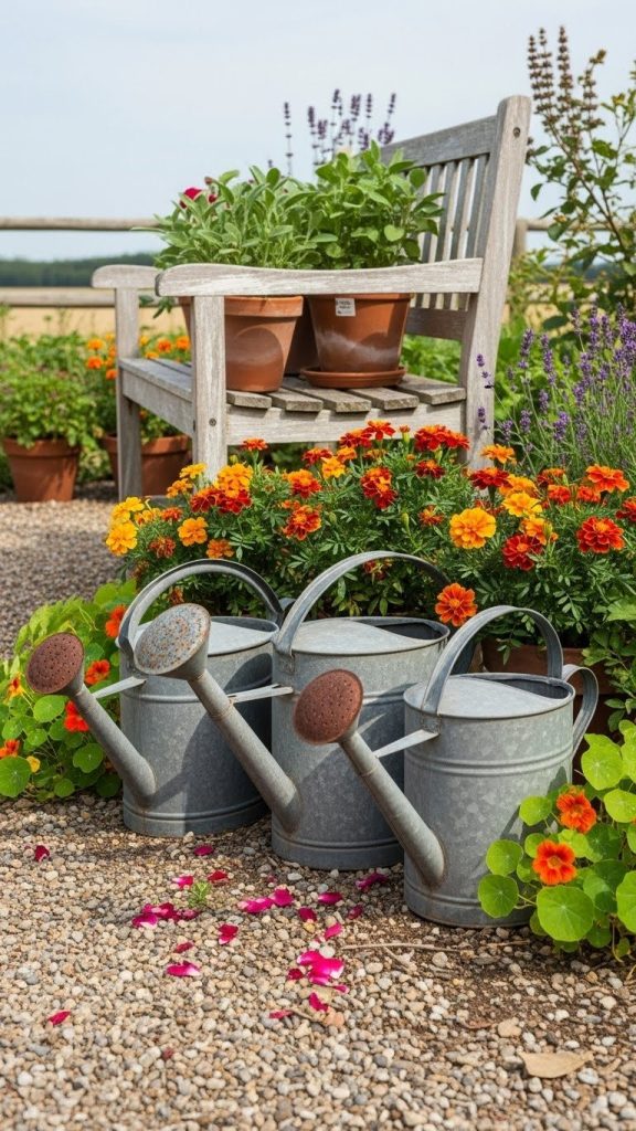 Watering cans, especially old metal ones, add character instantly. You can group a few together near a bench or fill one with flowers for a charming, lived-in look.