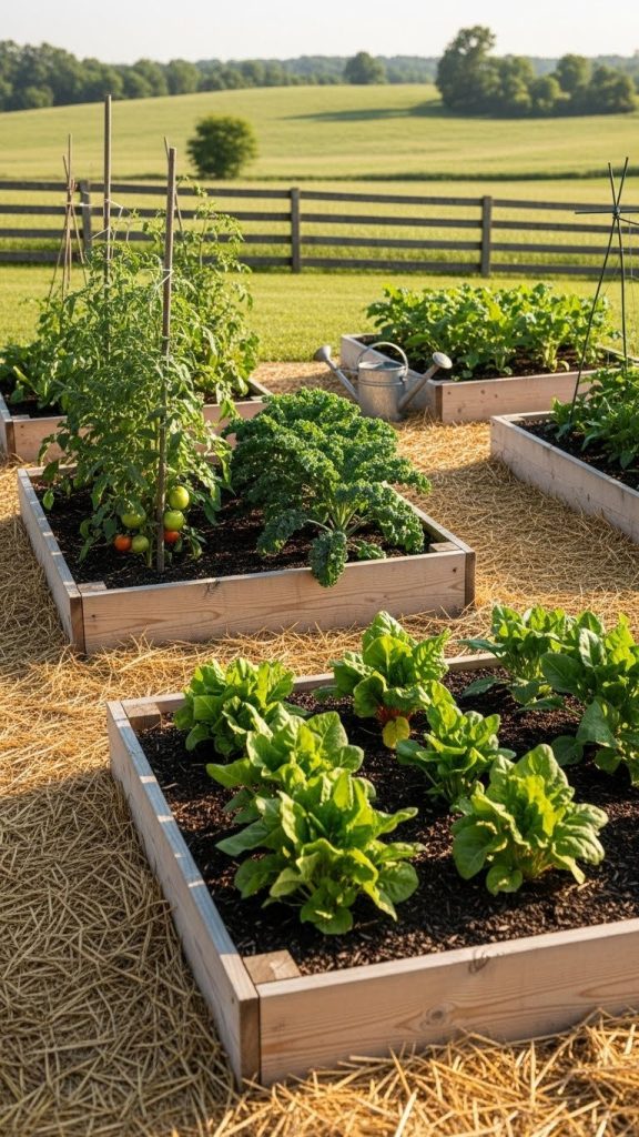 Wooden raised beds keep vegetable gardens looking tidy while still fitting the farmhouse vibe. Use untreated wood for safety, and arrange the beds in neat rows. Add straw pathways for extra texture.