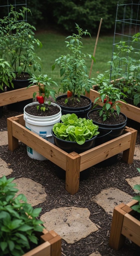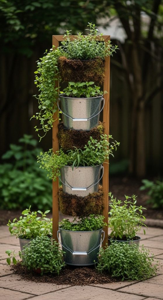 Ever wished your favorite herbs were right at arm’s reach when cooking? A tiered stand lets you stack 3–4 five-gallon buckets vertically, giving each plant its own sunlight while saving floor space.