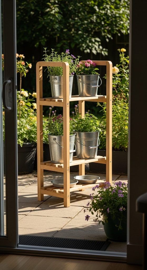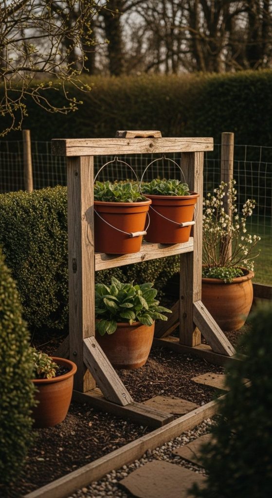 Building a stand from reclaimed wood not only looks rustic but also supports eco-friendly gardening. Perfect for a cottage-style patio.