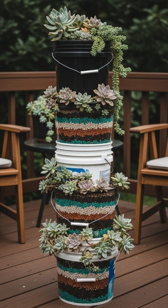 Succulents thrive in shallow soil and bright light, making them perfect candidates for stacked bucket gardens on compact stands.