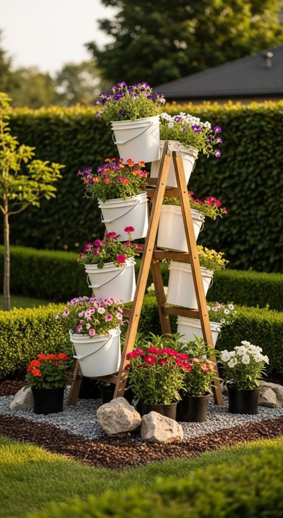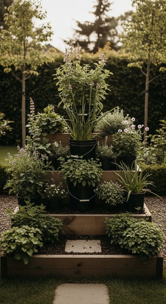 A stand with staggered bucket heights allows for varied plant types—tall, medium, and ground-covering—creating a lush, layered look.