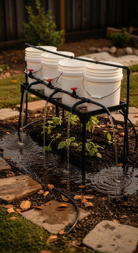 Connect a stand with multiple buckets using a DIY drip irrigation setup. Keeps soil consistently moist with minimal effort.
