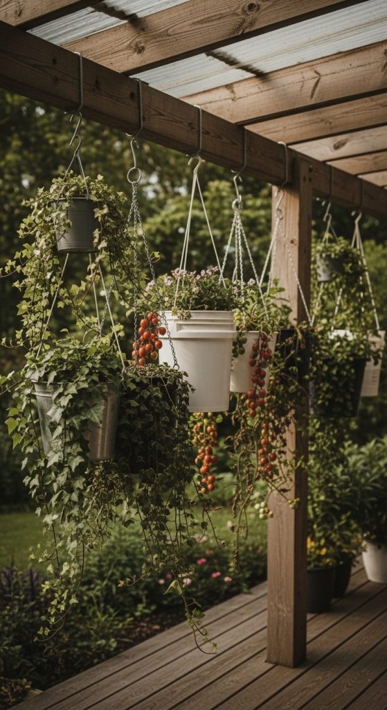 For decks with overhead beams, consider a hanging stand that suspends buckets at varying heights. Great for trailing plants like ivy or cherry tomatoes.