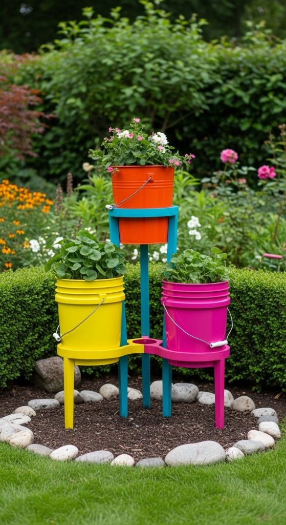 Add a pop of color by painting the stand and buckets in complementary hues. Turn functional gardening into a creative expression.