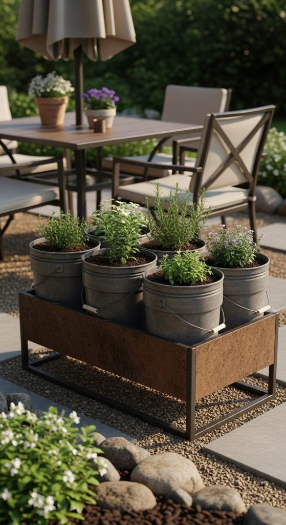 Integrate a bucket stand into your patio setup with herbs, flowers, or small veggies for instant garden dining experience.