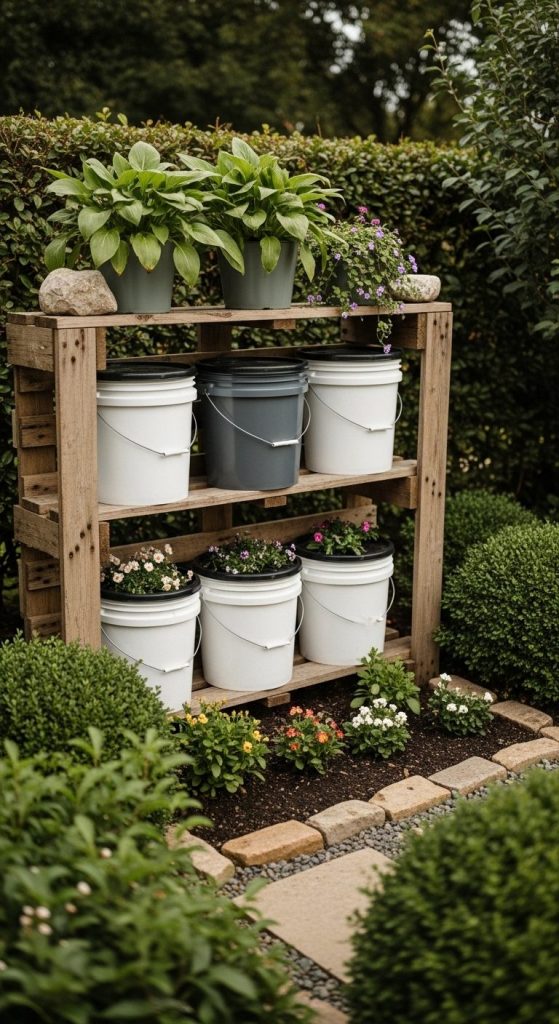 Use old pallets to create a rustic stand that holds multiple buckets. Great for DIY enthusiasts and upcycling fans.