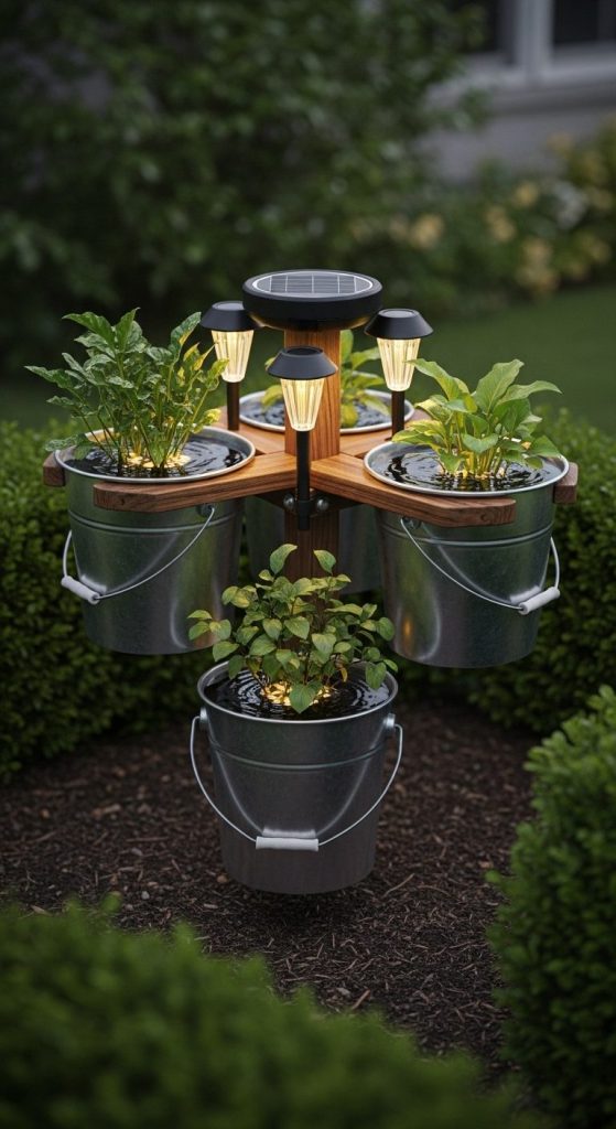 Takeaway: Layered stands turn a simple bucket garden into a mini botanical showcase.