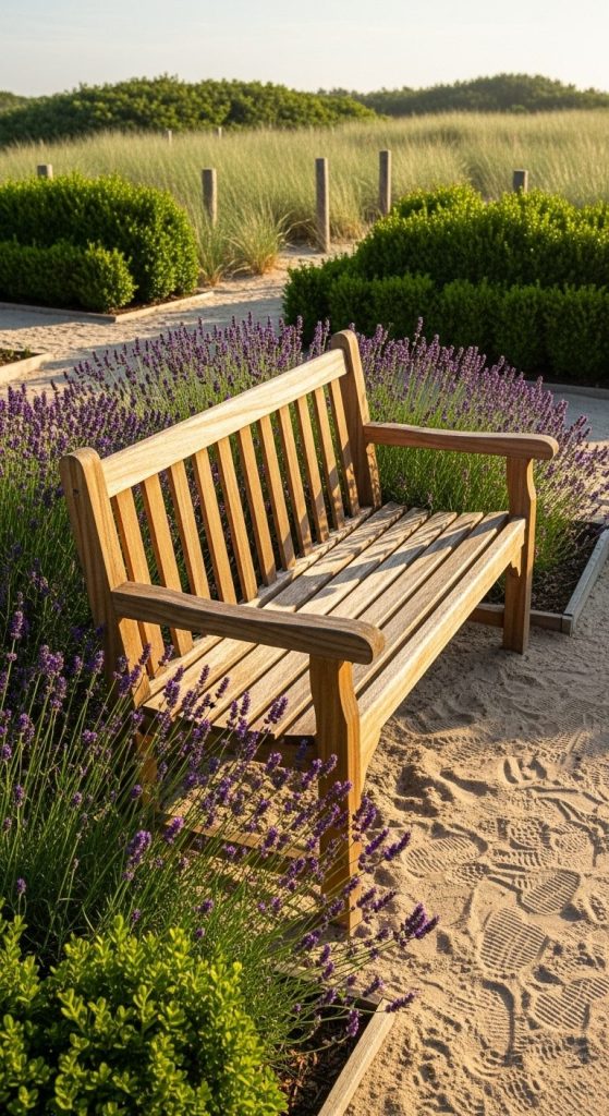 There’s something undeniably chic about a weathered teak bench surrounded by lavender or boxwood. It feels coastal, calm, and timeless.